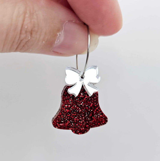 25mm RED GLITTER Acrylic BELLS with SILVER/GOLD MIRROR BOWS
