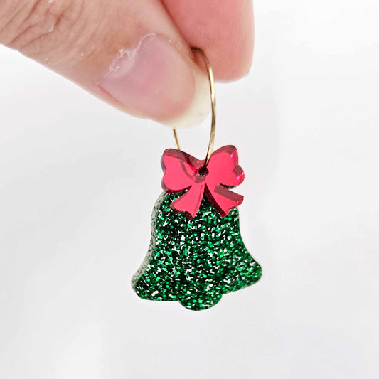 25mm GREEN GLITTER Acrylic BELLS with RED/GOLD MIRROR BOWS