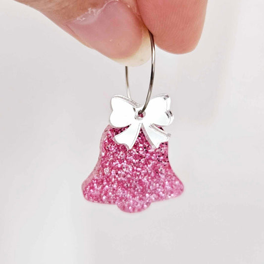 25mm PINK GLITTER Acrylic BELLS with PINK/SILVER MIRROR BOWS