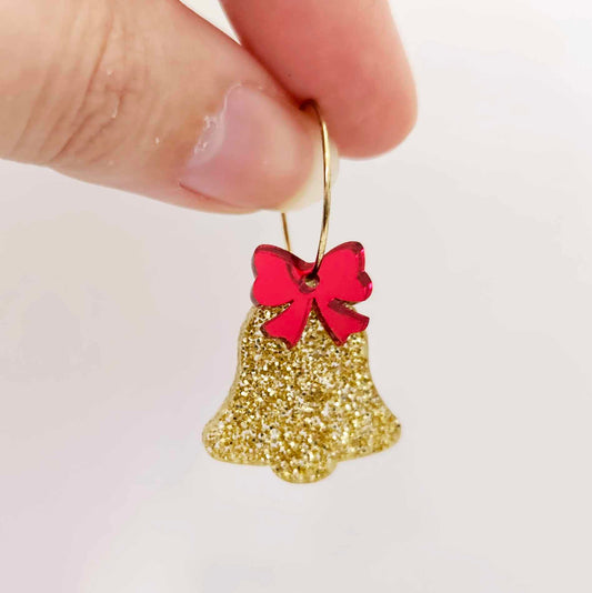 25mm GOLD GLITTER Acrylic BELLS with RED/GOLD MIRROR BOWS