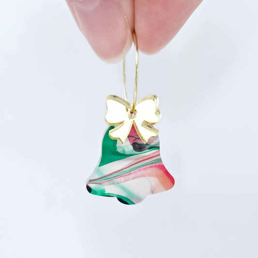 25mm CHRISTMAS SWIRL Acrylic BELLS with RED/GOLD MIRROR BOWS