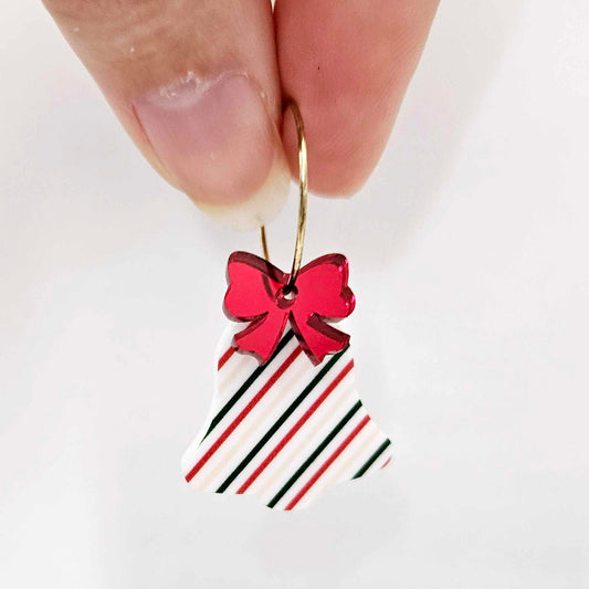 25mm STRIPY CHRISTMAS Acrylic BELLS with RED/GOLD MIRROR BOWS